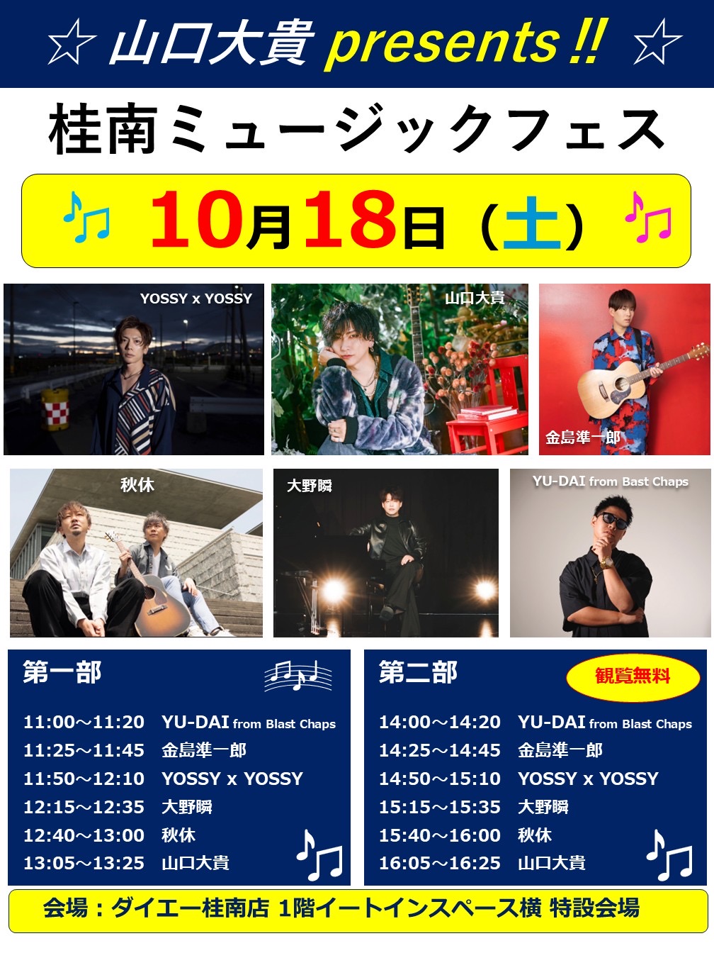 2025年10月18日(土) 山口大貴presents!! 「桂南ミュージックフェス」 出演:山口大貴 / 秋休 / 大野瞬 / YOSSYxYOSSY / 金島準一郎 / YU-DAI 会場:ダイエー桂南店1F特設ステージ 京都府京都市南区久世上久世町485 時間:11:00〜 料金:観覧無料