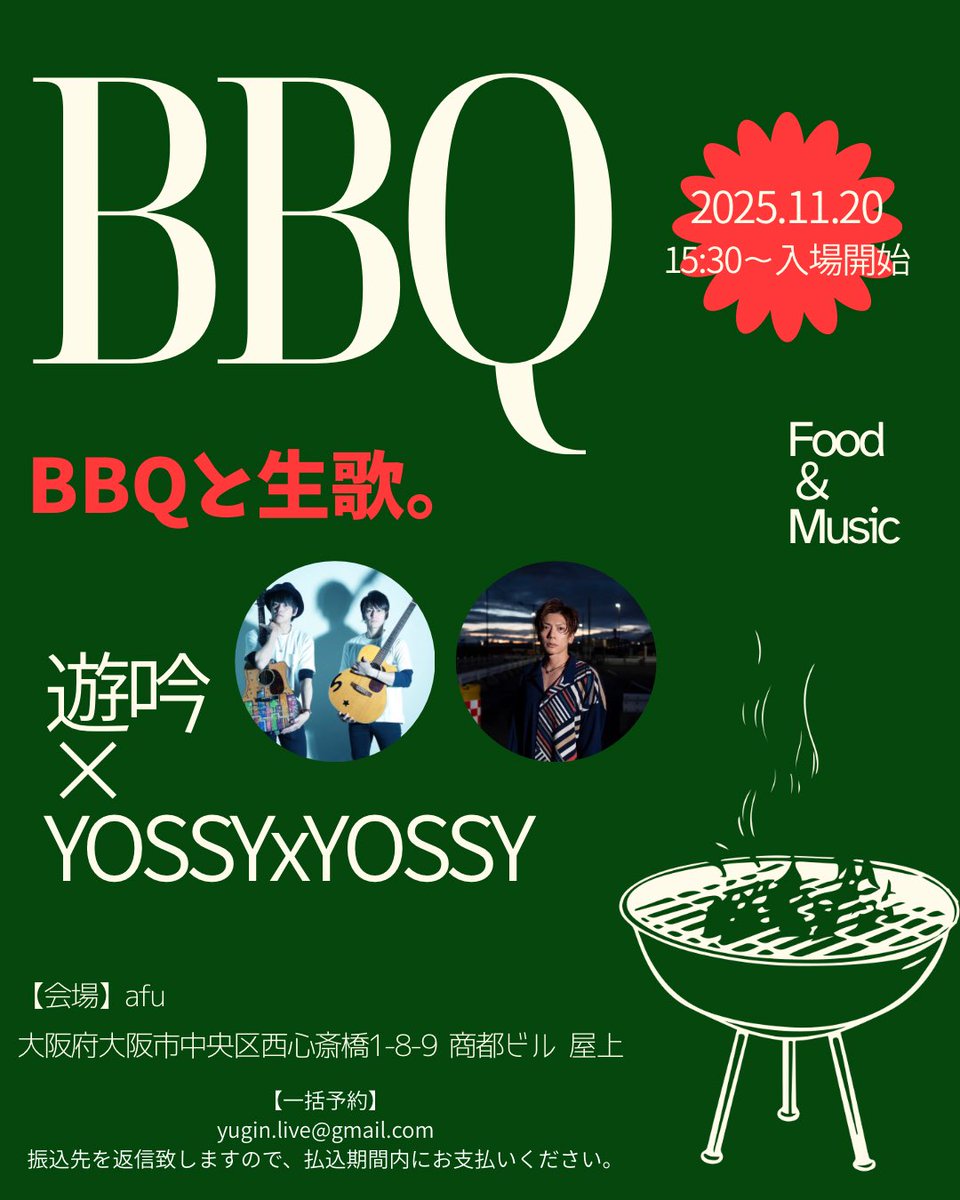 2025年11月20日(木) 遊吟YOSSYxYOSSY BBQと生歌。 入場15:30~ ¥8,000(D代別) 【会場】 afu 【入場】 1. 予約(整列順) 【一括予約】即時 yugin.live@gmail.com 振込先を返信致しますので、期間内にお支払いください。