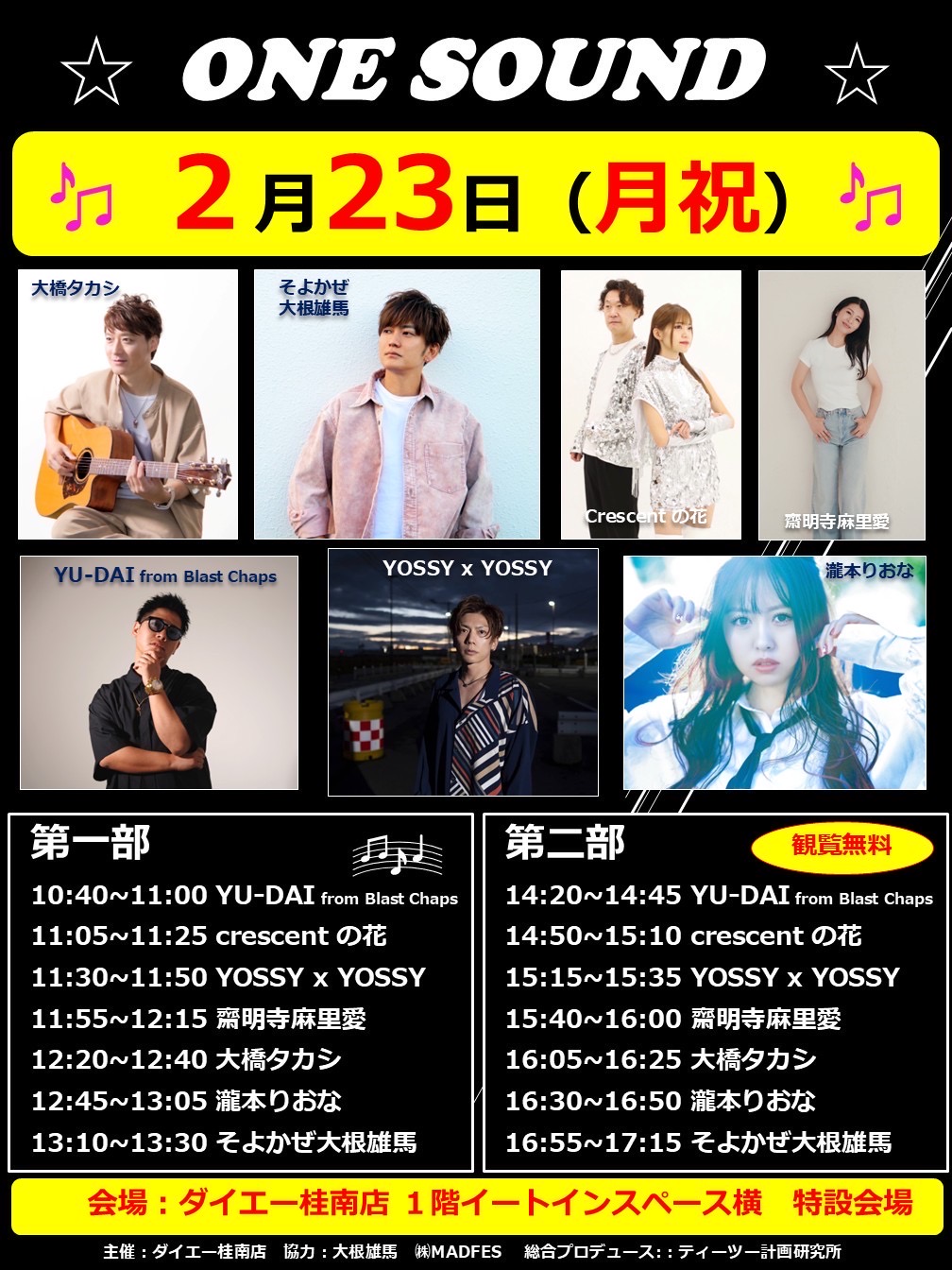 2026-02-23 「ONE SOUND」 ダイエー桂南 フリーライブ 「ONE SOUND」 ダイエー桂南 フリーライブ 2月 23 「ONE SOUND」 ダイエー桂南 フリーライブ 2月23日(月祝) 「ONE SOUND」 ダイエー桂南 観覧無料