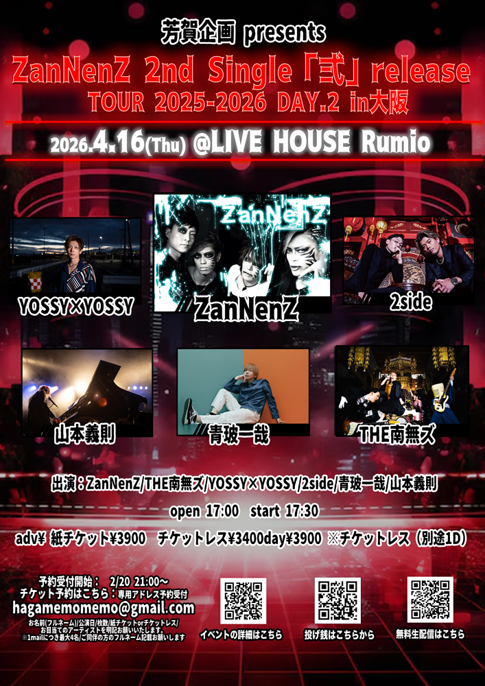 2026-04-16 ZanNenZ 2nd Single「弍」release TOUR 2025-2026 DAY.2 in大阪 ZanNenZ 2nd Single「弍」release TOUR 2025-2026 DAY.2 in大阪 4月 16 ZanNenZ 2nd Single「弍」release TOUR 2025-2026 DAY.2 in大阪 2026年4月16日(木)@LIVE HOUSE Rumio(大阪) タイトル:芳賀企画 presents Z […]