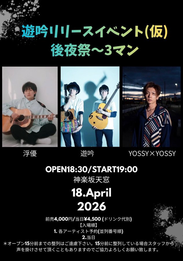 2026-04-18 遊吟リリースイベント(仮)後夜祭~3マン 遊吟リリースイベント(仮)後夜祭~3マン 4月 18 遊吟リリースイベント(仮)後夜祭~3マン ◾️2026年4月18日(土) 【タイトル】 遊吟リリースイベント(仮)後夜祭~3 […]